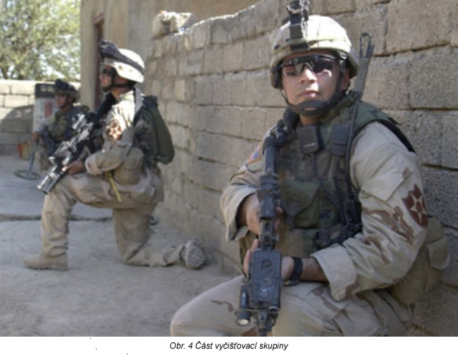 Postup při ovládnutí budovy. Složité členění budovy vyžaduje, aby vyčišťovací skupina postupovala na čele. I když není nezbytné, aby první osoba v zástupu byla současně velitelem skupiny, je důležité, aby to byl zkušený voják, který se dokáže správně rozhodovat při vedení útoku. Velitel vyčišťovací skupiny musí kromě čištění místností, zajištění nekombatantů a boje s nepřátelskými osobami zjistit, jaké další vchody (východy) vedou do místností a okamžitě se rozhodnout, jaké prostředky potřebuje k zajištění těchto vchodů a východů.