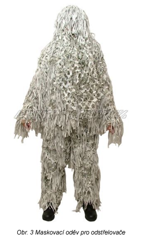 Skupina SKT musí být také schopna se skrytě pohybovat na otevřeném terénu. K tomu je třeba speciální maskovací oděv pro odstřelovače (obr. 3). V Iráku je během letních měsíců příliš velké horko na to, aby skupina SKT nosila takový maskovací oděv po dobu delší než nezbytně nutnou, proto při své činnosti využívají různé úkryty. Nadměrné používání stejných úkrytů (např. staveb) vede k tomu, že v nich povstalci umísťují nástražné výbušniny anebo organizují přepadení těchto objektů s cílem vzít koaliční vojáky do zajetí. Ke zvýšení četnosti použití staveb jako základen (úkrytů) je třeba zaznamenat druh místa, podmínky a okolnosti, za kterých byly využity. Počet osob SKT se bude lišit v závislosti na úkrytu, může se skládat z více osob, bude-li mít k dispozici prázdný dům s více místnostmi a jiný počet osob, bude-li mít svou dočasnou základnu v obydleném domě. Využívání obydlených domů snižuje pravděpodobnost výskytu nástražných výbušnin a poskytuje mnohem větší možnosti při volbě dočasné základny.