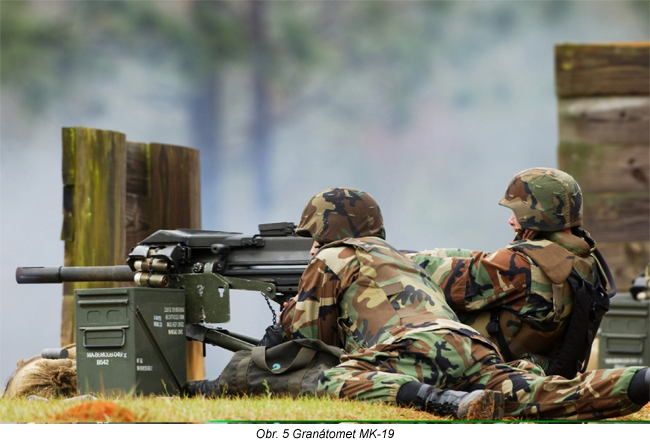 V prvé řadě jsme se museli naučit střílet z těžkých ručních zbraní, zejména z kulometu M2 (viz obr. 4). Tento kulomet znalo pouze pár vojáků, kteří sloužili u protitankových jednotek. Je to hlavní zbraň, která se používá při bojové činnosti na vozidlech. To jsme se dověděli po mnoha hodinách strávených při výcviku a střelbách na střelnici v prostoru předsunuté operační základny. K vedení boje jsme měli k dispozici také granátomet MK-19 (viz obr. 5) s účinným dostřelem 1 600 m. Většinu našeho sektoru tvořila rovinatá poušť, a proto tato zbraň byla účinná při střelbě na cíle ve vzdálenosti větší než 800 m. Vojáci museli tyto těžké ruční zbraně perfektně zvládnout, a to za jakýchkoli podmínek ještě před plněním prvního bojového úkolu. Použití a střelbu z těchto zbraní je nutno zvládnout již v mateřských posádkách. Lehké pěší jednotky však tuto zbraň nemají ve výzbroji, a proto příslušníci pěších jednotek musejí udělat vše pro to, aby ji měli při přípravě na misi k dispozici.