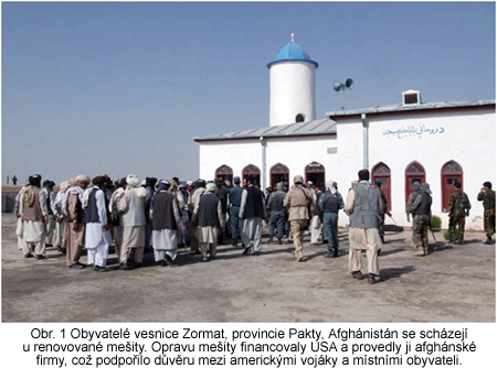 Obr. 1 Obyvatelé vesnice Zormat, provincie Pakty, Afghánistán se scházejí u renovované mešity. Opravu mešity financovaly USA a provedly ji afghánské firmy, což podpořilo důvěru mezi americkými vojáky a místními obyvateli.