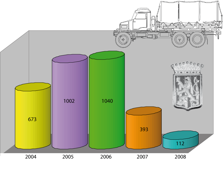 Celkově bylo v analyzovaném období (2004-2008) vyřazeno 3 220 kusů vozidel na podvozcích PV3S. Rozklad za jednotlivé roky prezentuje graf číslo 2.