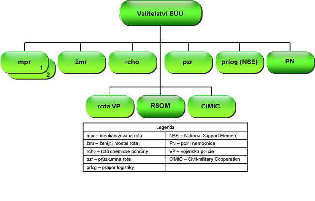 Brigádní úkolové uskupení může mít proměnlivou (ne pevně danou) organizační strukturu, která je účelově sestavena v závislosti na stanovených úkolech operace. Organizační struktura BÚU v operaci PFOR je znázorněna na obrázku 4.