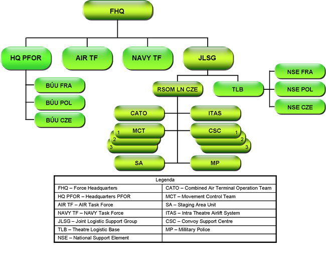 Pro provedení operace PFOR byla organizačně vytvořena jedna mezinárodní jednotka RSOM se servisní působností na celé ÚU. Začlenění jednotky RSOM a její stručné členění je na obrázku 5.