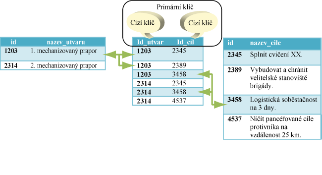 Na schématu č. 3 je zřejmá vazba 1:N mezi jednotlivými záznamy v tabulkách podle jednotlivých klíčů (primárních a cizích). Jeden útvar má tak přidělen pomocí vazby mezi tabulkami jeden a více cílů.