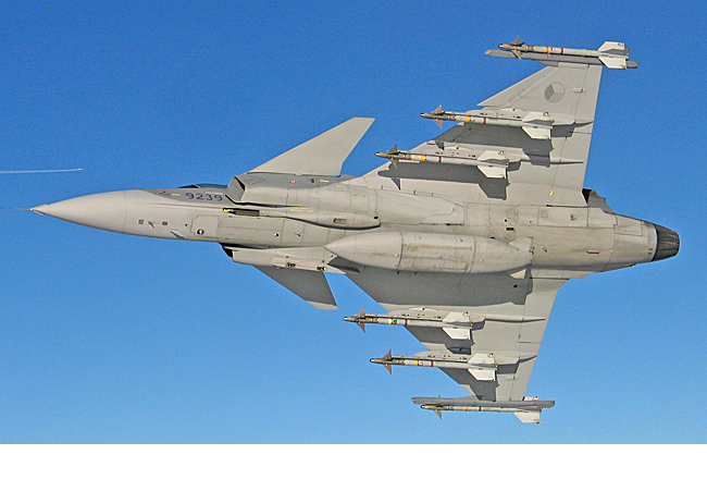 Obrázek č. 4: JAS-39 Gripen podvěšen 6x PLŘS a 1x přídavná nádrž (Pramen: digitální archiv 21. zTL)