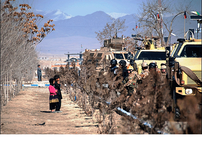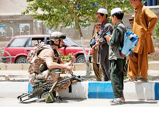 Obrázek č. 2 Příslušník demonstrační patroly v hlavním městě provincie Pol-e Alam při reakci na nikdy neutuchající dětský zájem o vojáky a jejich výzbroj. (Pramen: vlastní)