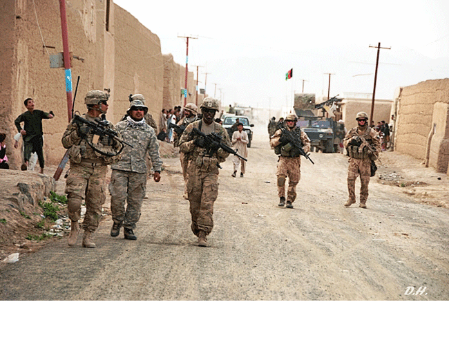 Obrázek č. 12 Společná americko-česká patrola při pěším přesunu zájmovou oblastí. Vícedenní rozšířené operace jsou doplněny specialisty PsyOp. (Pramen: Daniel Hlaváč, 2011)