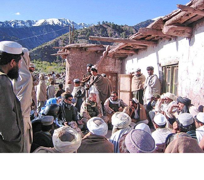 Obrázek č. 6 Kmenový sněm (šura) jako reakce na významnou událost vesnice. Pěší patrola PRT Logar se zastavila při demonstrační patrole v odlehlé vysokohorské oblasti distriktu Azra. Za PRT Logar hovoří specialista CIMIC/ PsyOp. (Pramen: vlastní)