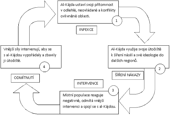 Kilcullen popisuje čtyři fáze syndromu: infekci, šíření nákazy, intervenci a odmítnutí (ve smyslu ,,imunitní reakce"). Ačkoliv Slovník spisovného jazyka českého uvádí slova ,,infekce" (infection) a ,,nákaza" (contagion) jako synonyma, v angličtině se setkáváme s jistým významovým odlišením [28]. ,,Infection" vyjadřuje prvotní proces nakažení organismu, naproti tomu ,,contagion" je chápáno spíše jako šíření nemoci z organismu na organismus [27]. Tyto fáze zde za pomoci překladu klíčových úryvků blíže popíšeme [17 s. 35-38]: