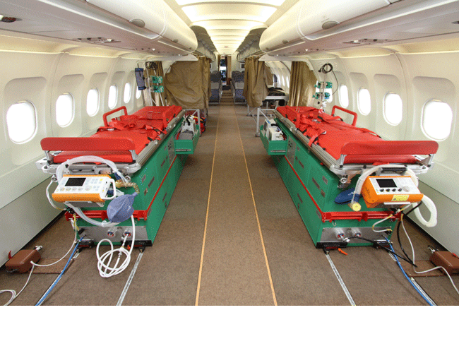 Pro zabezpečení systému MEDEVAC lze využít vrtulníků, ale i letounů speciálně vybavených zdravotnickou zástavbou. Zdravotnické vybavení letounu je odnímatelné a ukládá se v soupravě letounového příslušenství.