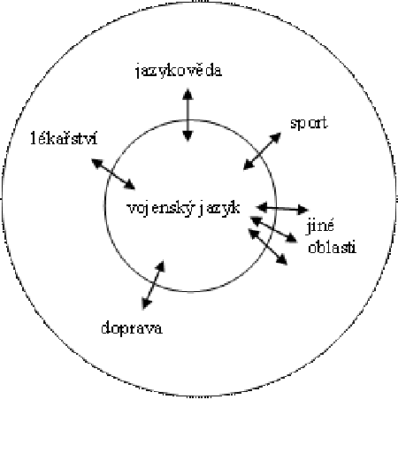 Mezioborové propojení jazyka. V jednotlivých oborech dochází k vzájemnému přejímání a ovlivňování užívaných slov. Češi, tak jako i ostatní národy světa, mají svoji historii. Tento fakt ovlivňuje i současnou Armádu České republiky (AČR) a její vojenský jazyk. Český vojenský jazyk byl například několik desítek let ovlivňován existencí Rakousko-uherské monarchie a ve 2. polovině dvacátého století podléhal dalším vlivům hlavně díky okupaci Československa vojsky Sovětského svazu. Nyní vojenský jazyk ovlivňuje členství AČR v Severoatlantické alianci. Naopak, vliv českého vojenského jazyka na jiné vojenské jazyky můžeme považovat za zanedbatelný.