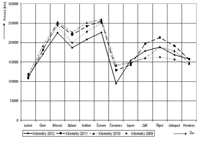Z grafu 1 je patrné, že proběh v kilometrech se roce 2011 ustálil. V roce 2011 bylo ujeto o 209 012 km více než v roce 2012. Na tomto základě lze předpokládat, že provoz v roce 2013 nebude pravděpodobně vyšší než v roce 2011.