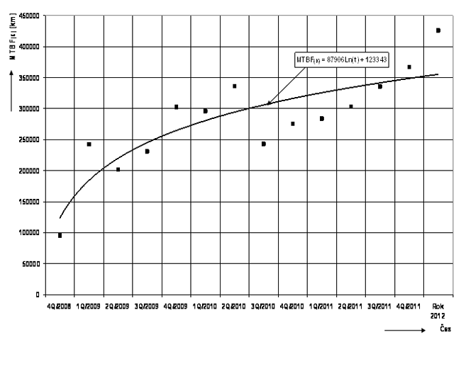 Graf 3 Vývoj kumulované hodnoty MTBF od zahájení vojskového provozu (Pramen: [8])